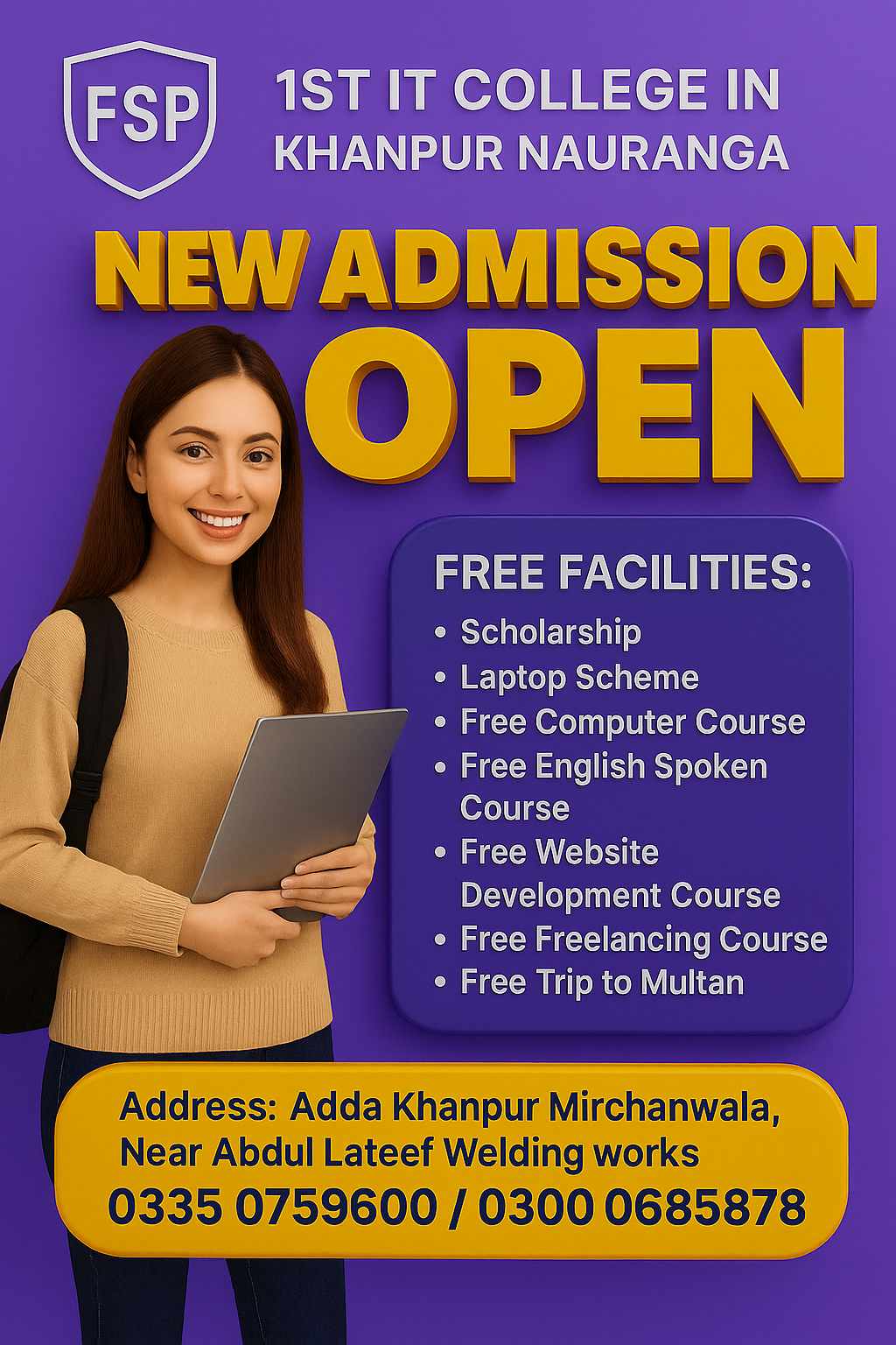 Admissions Open at FSP Education System, Khanpur (Nauranga) in FA (IT), ICS, and ADP Programs! Along with studies, gain professional skills in Freelancing, Web Development, and English Communication – all for free!.